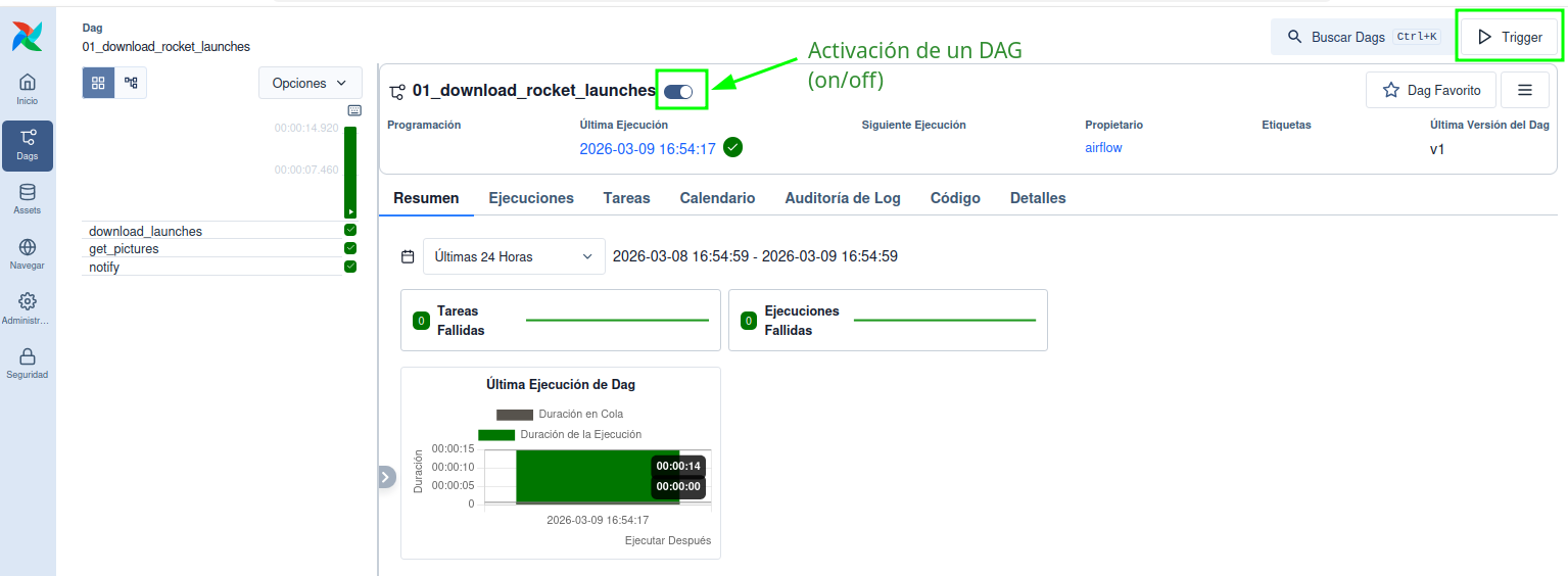 Cuando nos encontramos dentro de la vista detallada de un DAG, como se muestra en la Figura 3.6 podemos activar o desactivar el DAG mediante un botón deslizador ubicado cerca de su nombre. Al activar el DAG, este comenzará a ejecutarse según la programación definida en su configuración, y se podrán visualizar las ejecuciones en tiempo real a través de la interfaz web. Además, también se puede ejecutar el DAG manualmente, para lo que podemos pulsar el botón “Trigger” situado en la parte superior derecha de la interfaz, lo que iniciará una ejecución inmediata del DAG, independientemente de su programación regular. Esta funcionalidad es útil para pruebas o para ejecutar tareas de forma ad-hoc.