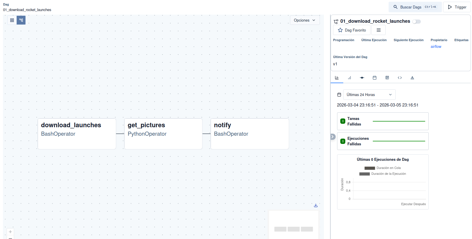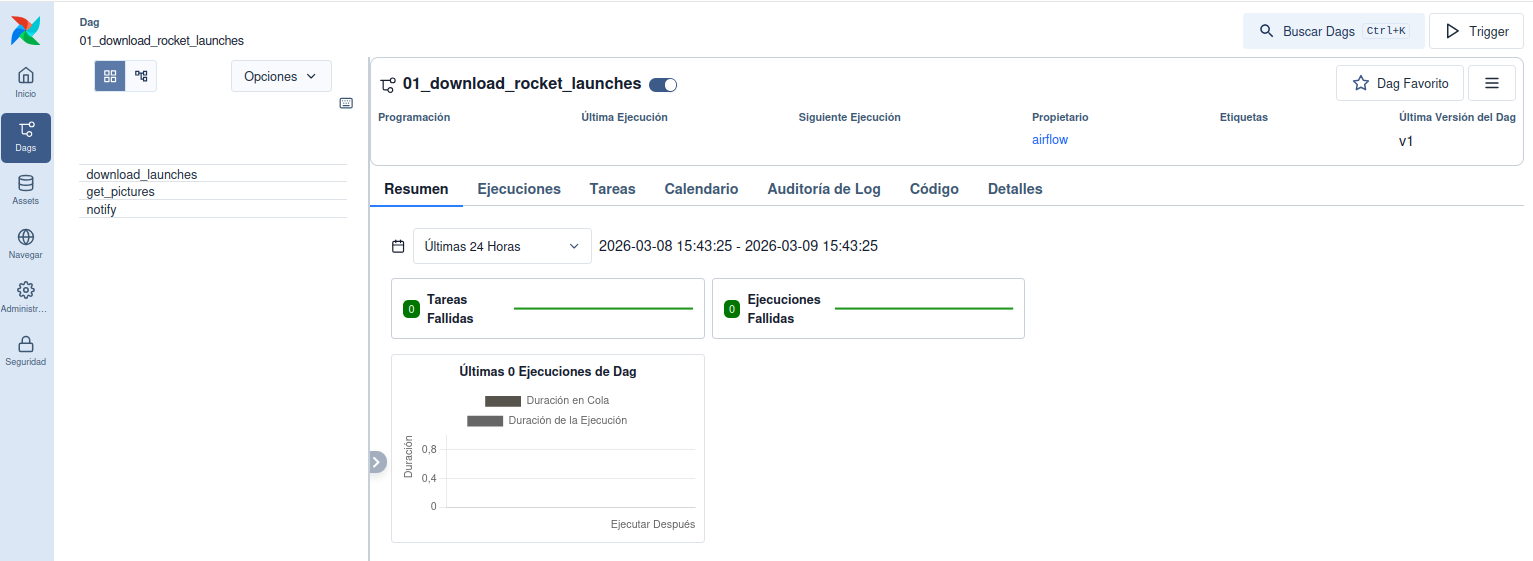 Haciendo clic en el nombre de un DAG específico, se accede a una vista detallada de ese DAG, donde se pueden ver las tareas que lo componen, su estado actual, y realizar acciones específicas sobre cada tarea. Esta vista se muestra en la Figura 3.3, incluyendo un gráfico de dependencias entre las tareas, un listado de las tareas con su estado actual, y opciones para ejecutar o revisar los logs de cada tarea.