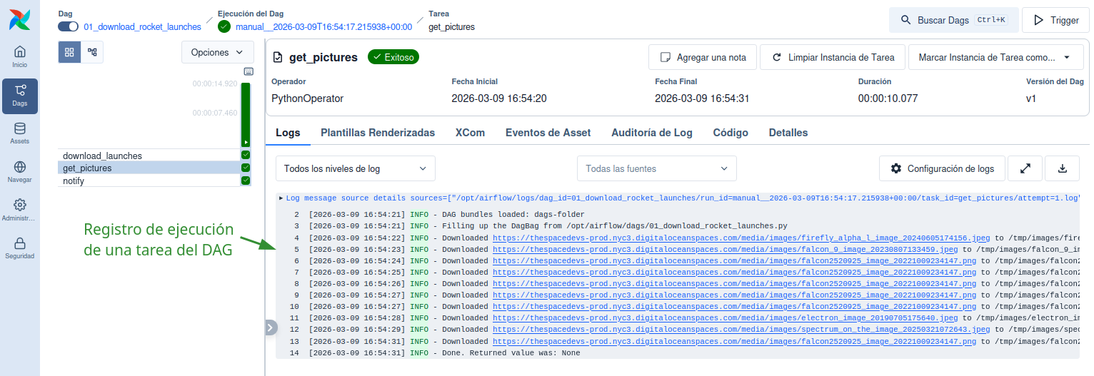 Una vez concluida la ejecución de un DAG, se puede revisar el estado de cada tarea y acceder a los logs para verificar que todo se ha ejecutado correctamente o para identificar posibles errores. La Figura 3.7 muestra la vista de logs de una tarea específica, donde se pueden revisar los mensajes generados durante su ejecución.