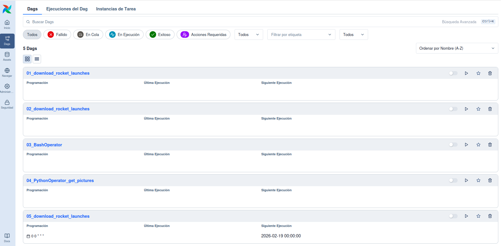 Si pulsamos sobre el botón “DAGs” en la columna de la izquierda, se accede a una vista más detallada de los DAGs disponibles, donde se pueden activar o desactivar, ejecutar manualmente, o revisar su historial de ejecuciones. Esta vista se muestra en la Figura 3.2.