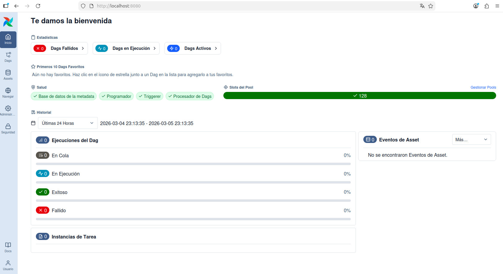 En la columna de la izquierda aparecen los botones principales que permiten acceder a diferentes secciones de la interfaz, como la vista de DAGs, la vista de tareas, los logs y la configuración del sistema. En la parte superior aparecen varias etiquetas que permiten filtrar los DAGs por su estado, como “Fallidos”, “En Ejecución”, o “Activos” etc. Esta visión se completa en la parte central, donde se listan los DAGs disponibles con información sobre su estado, última ejecución, y acciones disponibles. En la parte central derecha se muestra un listado de “Eventos de Asset”, que pueden estar asociados a los DAGs o tareas, y que permiten un seguimiento detallado de los cambios y eventos relacionados con los activos gestionados por Airflow.